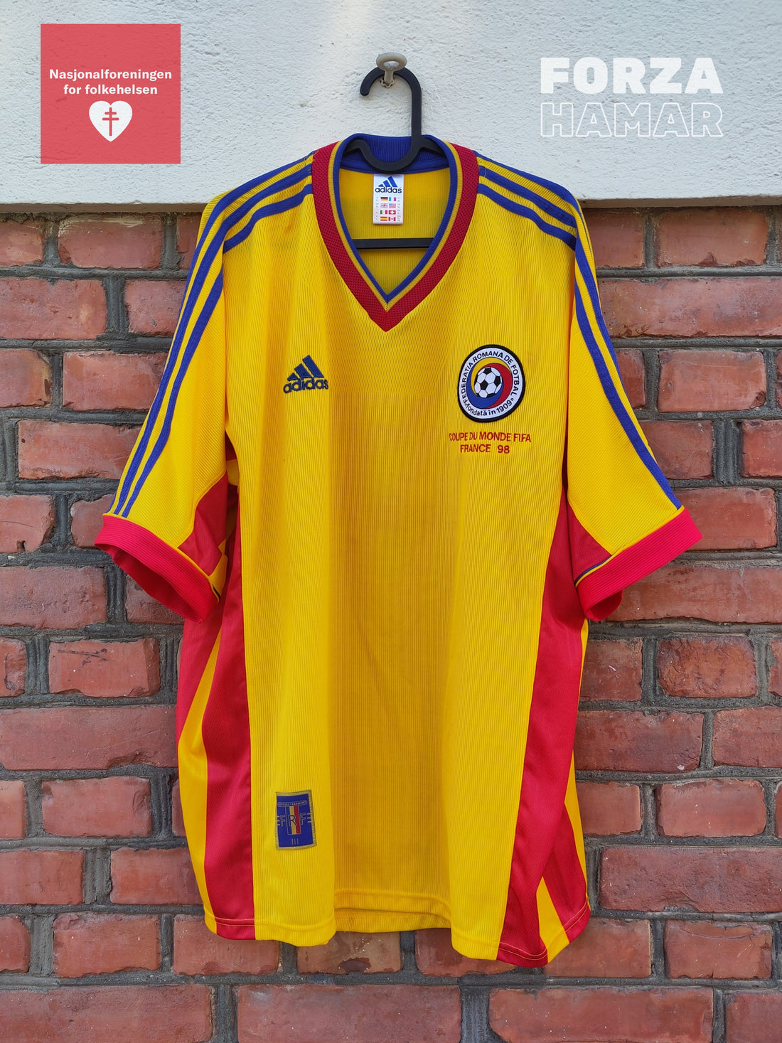 Buy this shirt at auksjonen.no from 1.-11. december 2024.Used by Dorinel Munteanu and swapped with Norway player Vegard Heggem after Norway - Romania 0-0 (19.08.1998).