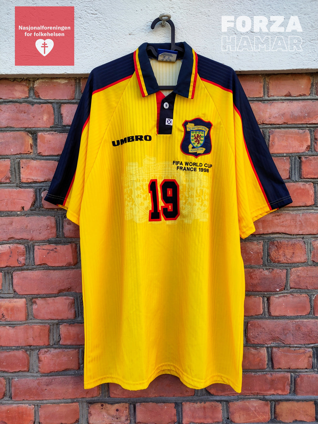Derek Whyte's jersey from the 1998 World Cup. Whyte swapped his shirt with Norwegian player Vegard Heggem after Scotland - Norway 1-1. Both players was unused substitutes. Size XL.