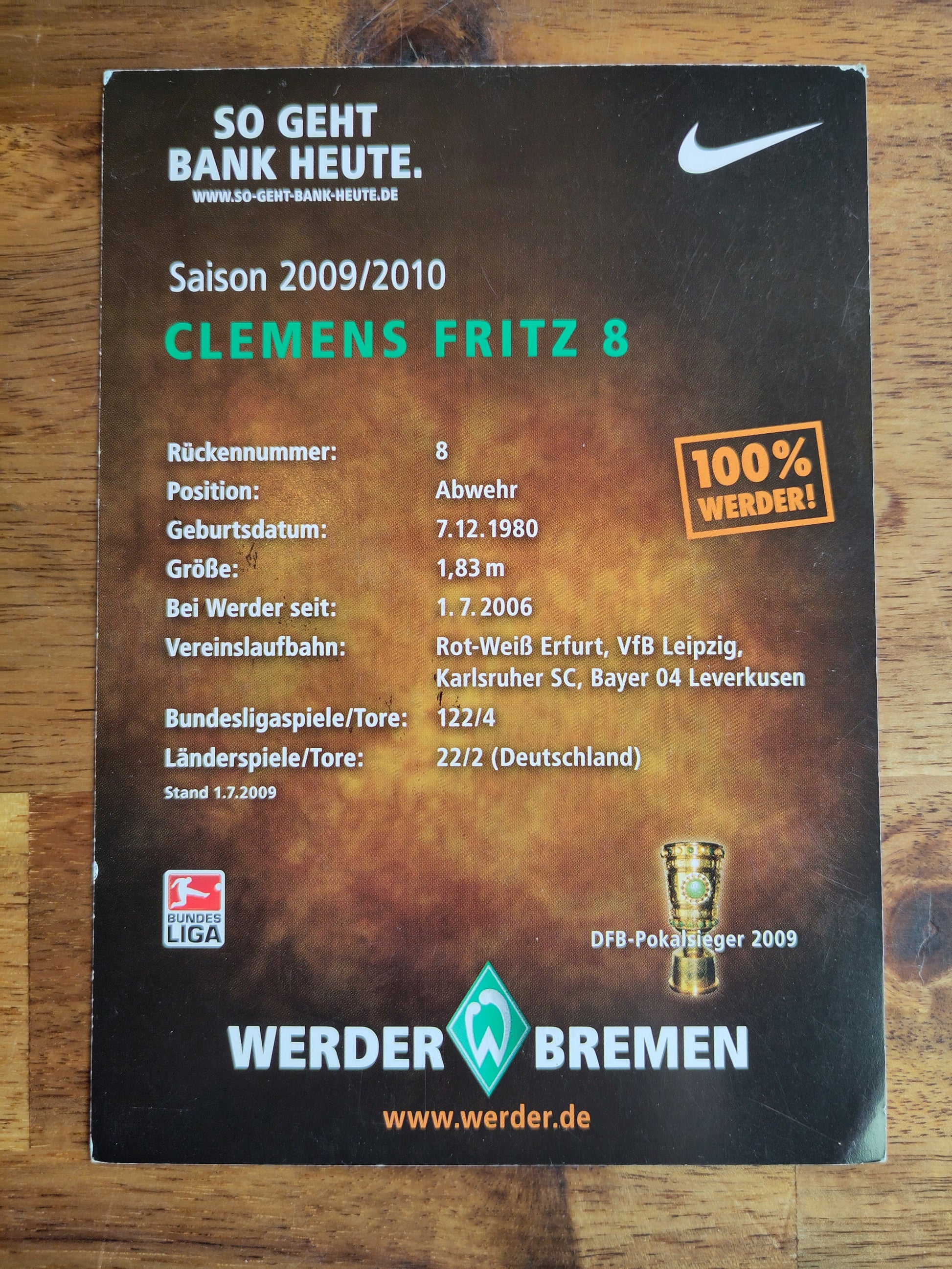 Werder Bremen autografkort signert Clemens Fritz